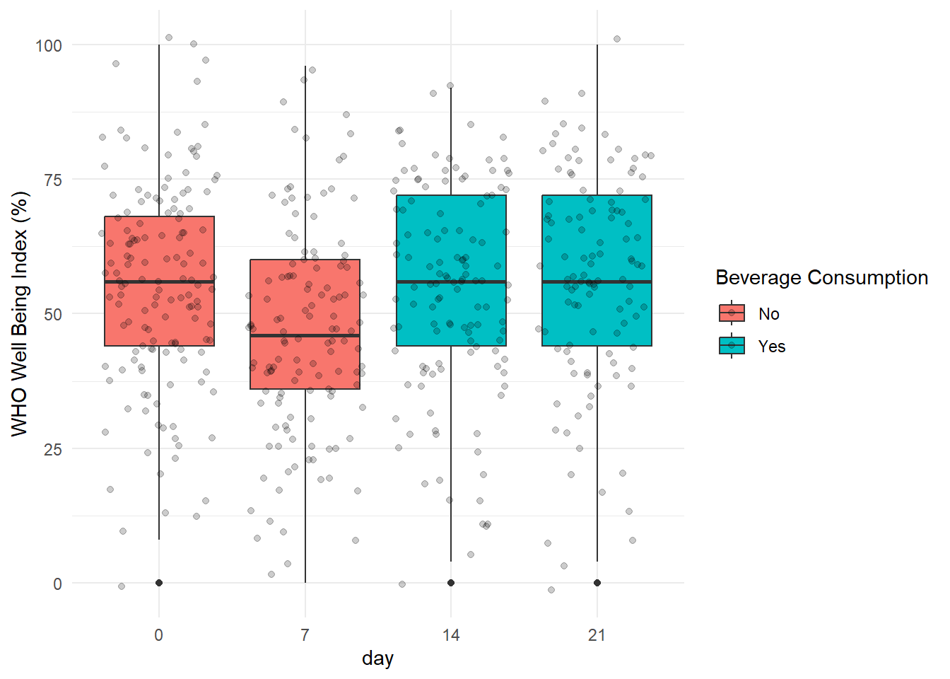 data_who_calc %>%mutate("Beverage Consumption"=ifelse(day >7, "Yes", "No"),day =factor(day, levels =c(0, 7, 14, 21))) %>%ggplot(aes(day, Value, fill =`Beverage Consumption`))+geom_boxplot()+geom_jitter(alpha =0.2)+ylab("WHO Well Being Index (%)")+theme_minimal()