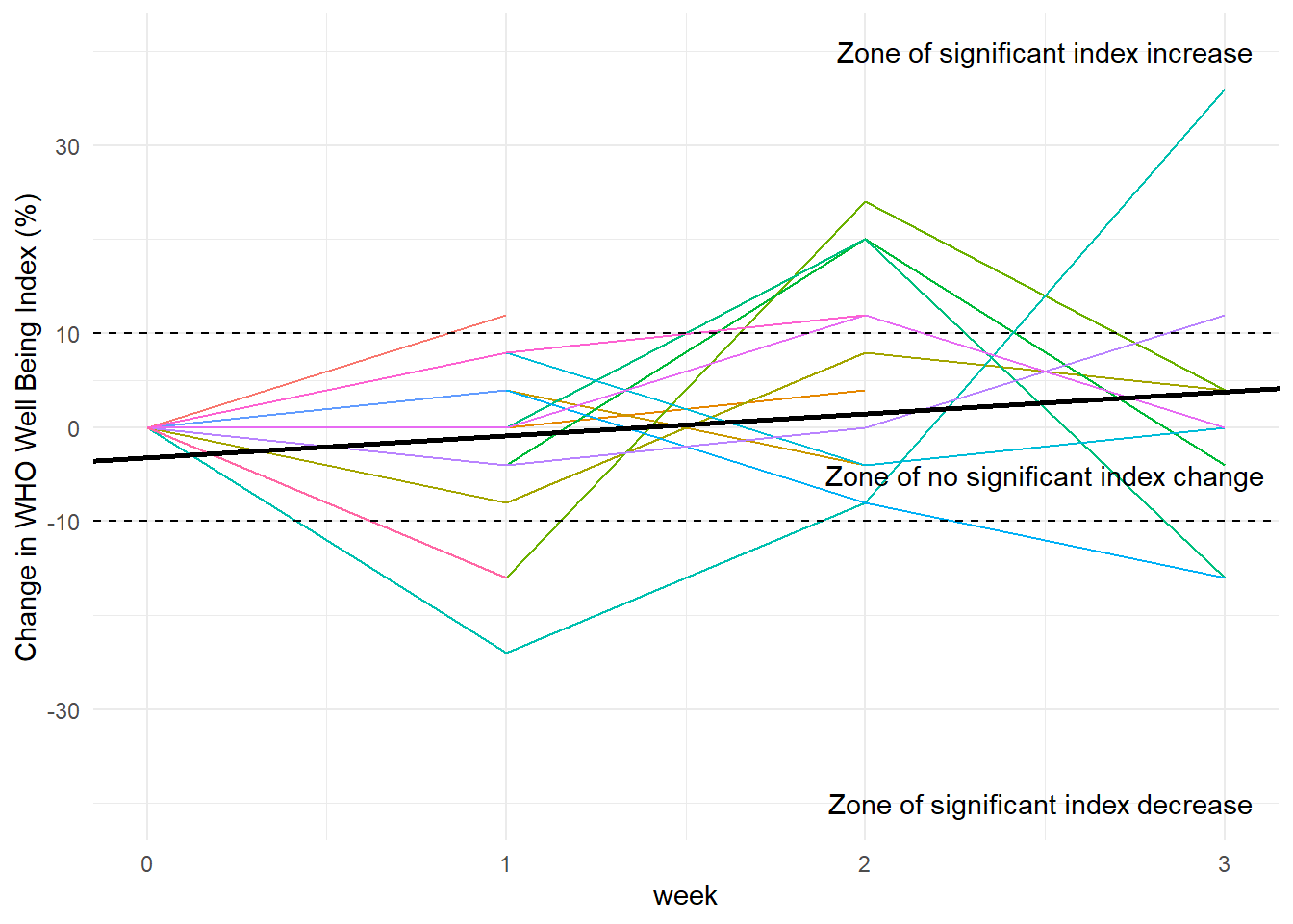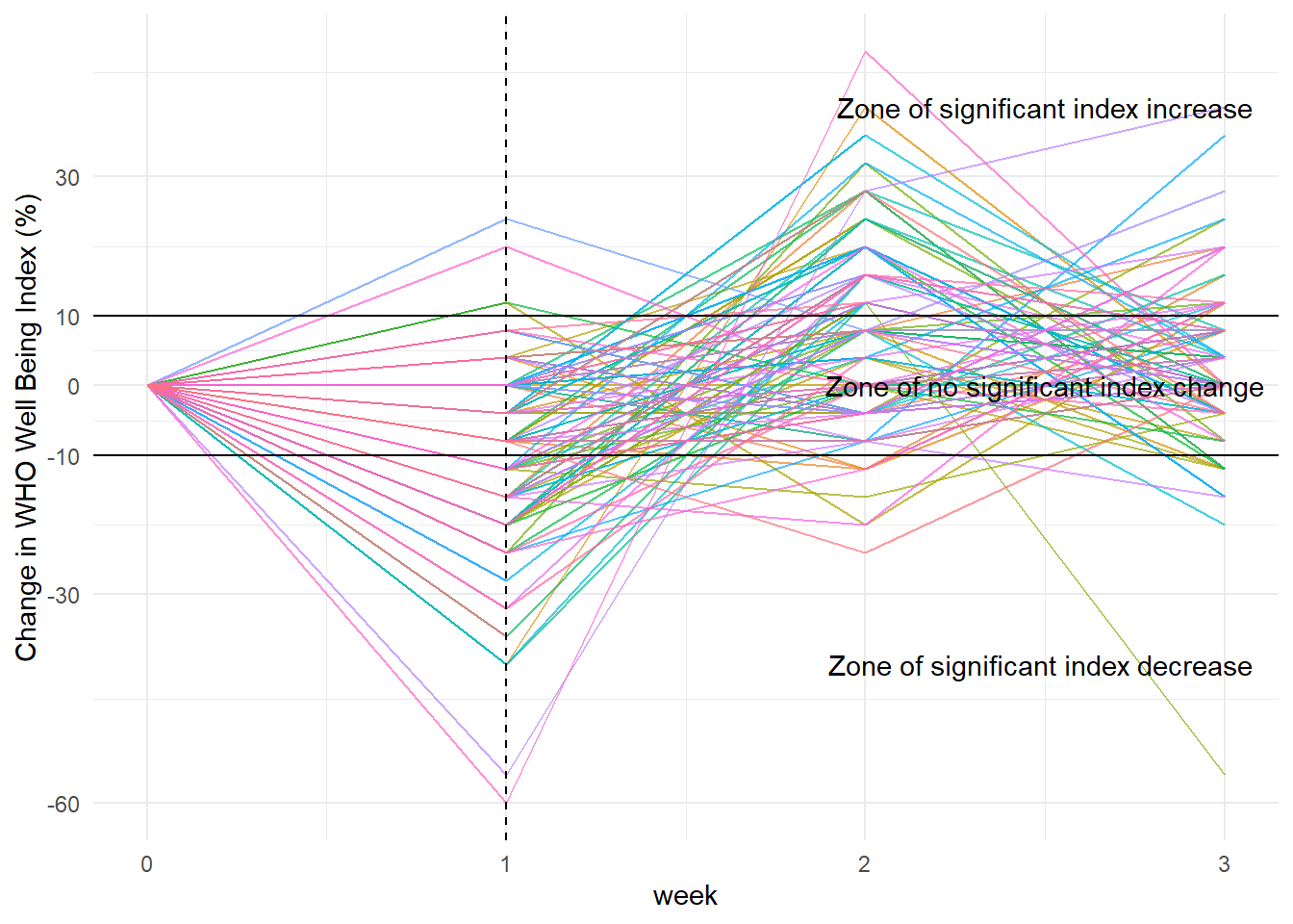 # Convert the dataframe to a wide format to obtain one row per id:data_who_wide <- data_who_calc %>%select(-Battery) %>%pivot_wider(names_from = day, values_from = Value)# I create a dataframe whith the differences in who-index per weekwho_index_dif <-tibble(id = data_who_wide$id,"0"=0,"1"= data_who_wide$`7`- data_who_wide$`0`,"2"= data_who_wide$`14`- data_who_wide$`7`,"3"= data_who_wide$`21`- data_who_wide$`14`,"total"= data_who_wide$`21`- data_who_wide$`0`)# dataframe in long format with weekly differences per participantwho_index_dif_weekly <- who_index_dif %>%select(-total) %>%pivot_longer(cols =2:5, names_to ="week", values_to ="Value") %>%mutate(week =as.numeric(week))#dataframe with total differences day 0 to 21who_index_dif_total <- who_index_dif %>%select(id, total)who_index_dif_weekly %>%mutate(id =as_factor(id)) %>%ggplot(aes(week, Value, color = id))+geom_line(alpha =0.7)+geom_vline(xintercept =1, linetype =2)+theme_minimal()+theme(legend.position ="none")+geom_hline(yintercept =c(10, -10))+scale_y_continuous(breaks =c(-60, -30, -10, 0, 10, 30))+ylab("Change in WHO Well Being Index (%)")+annotate(geom ="text", x =2.5, y =40, label ="Zone of significant index increase")+annotate(geom ="text", x =2.5, y =0, label ="Zone of no significant index change")+annotate(geom ="text", x =2.5, y =-40, label ="Zone of significant index decrease ")