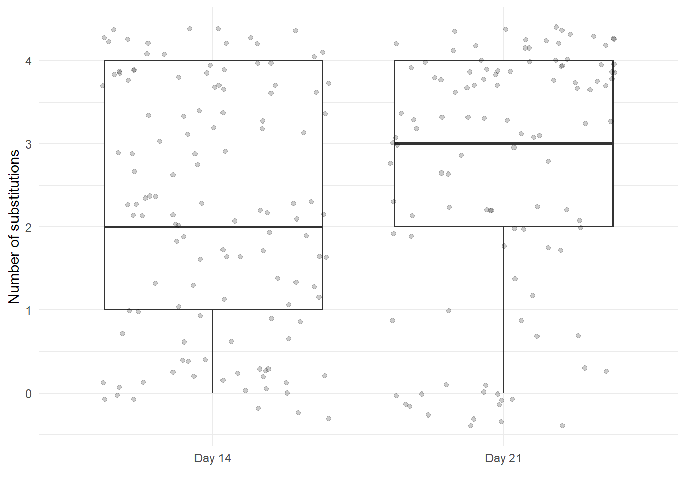 There is a statistically significant change in the number of times that alcohol is substitued by the infused beverage on day 21 compared to day 14. On day 21, alcohol was substituted 0.53 more times than on day 14.