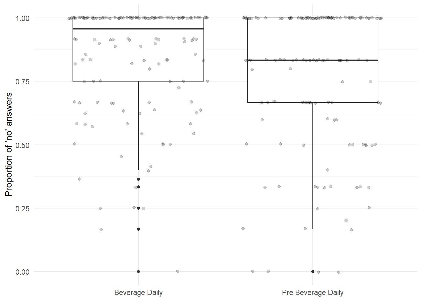 The proportion of ‘no’ answers during beverage was 7% higher than in the pre beverage. This difference was statistically significant with p-value = 7e-05.