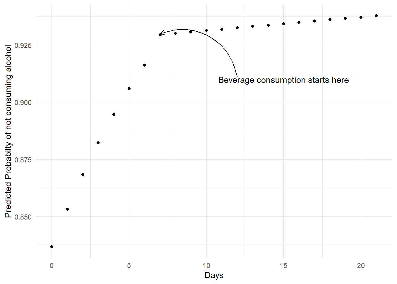 #set with the 0 to 21 daysdataset <-with(daily_alc, tibble(day =c(0:21), bev =as_factor(c(0, 0, 0, 0, 0, 0, 0,1, 1, 1, 1, 1, 1,1, 1, 1, 1, 1, 1,1, 1, 1))))predicted <-predict(model2, newdata = dataset, type ="response", re.form =NA)prediction <-tibble(Day =c(0:21), "Predicted values"= predicted)prediction %>%ggplot(aes(Day, `Predicted values`)) +geom_point() +xlab("Days") +ylab("Predicted Probabilty of not consuming alcohol") +theme_minimal() +annotate(geom ="text", x =15, y =0.91, label ="Beverage consumption starts here") +geom_curve(aes(x =12, y =0.911, xend =7, yend =0.93),arrow =arrow(length =unit(0.25, "cm"), ends ="last", type ="open") )